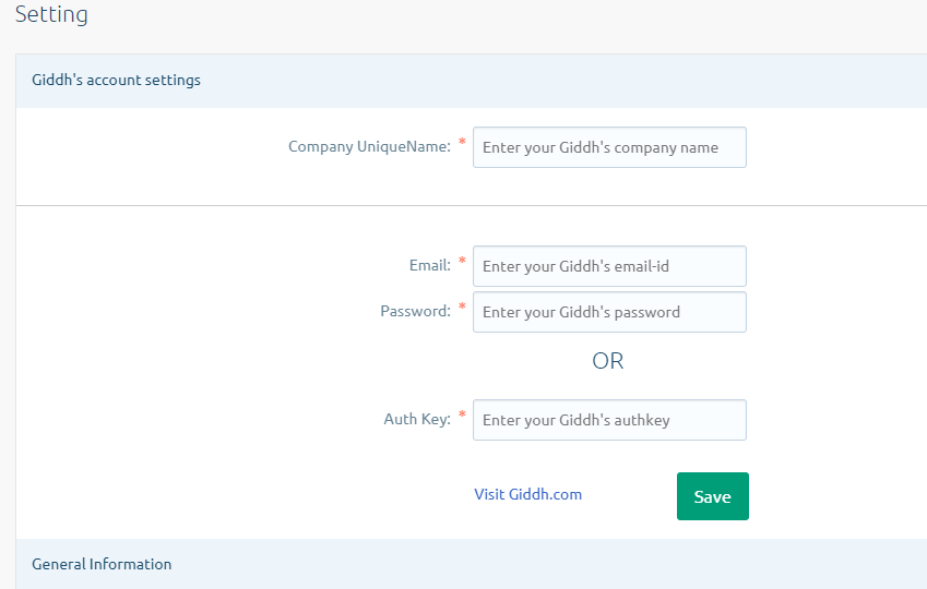 F. Once you get company unique Username and Authkey or username password, return to the Giddh application installed on the Zencommerce.